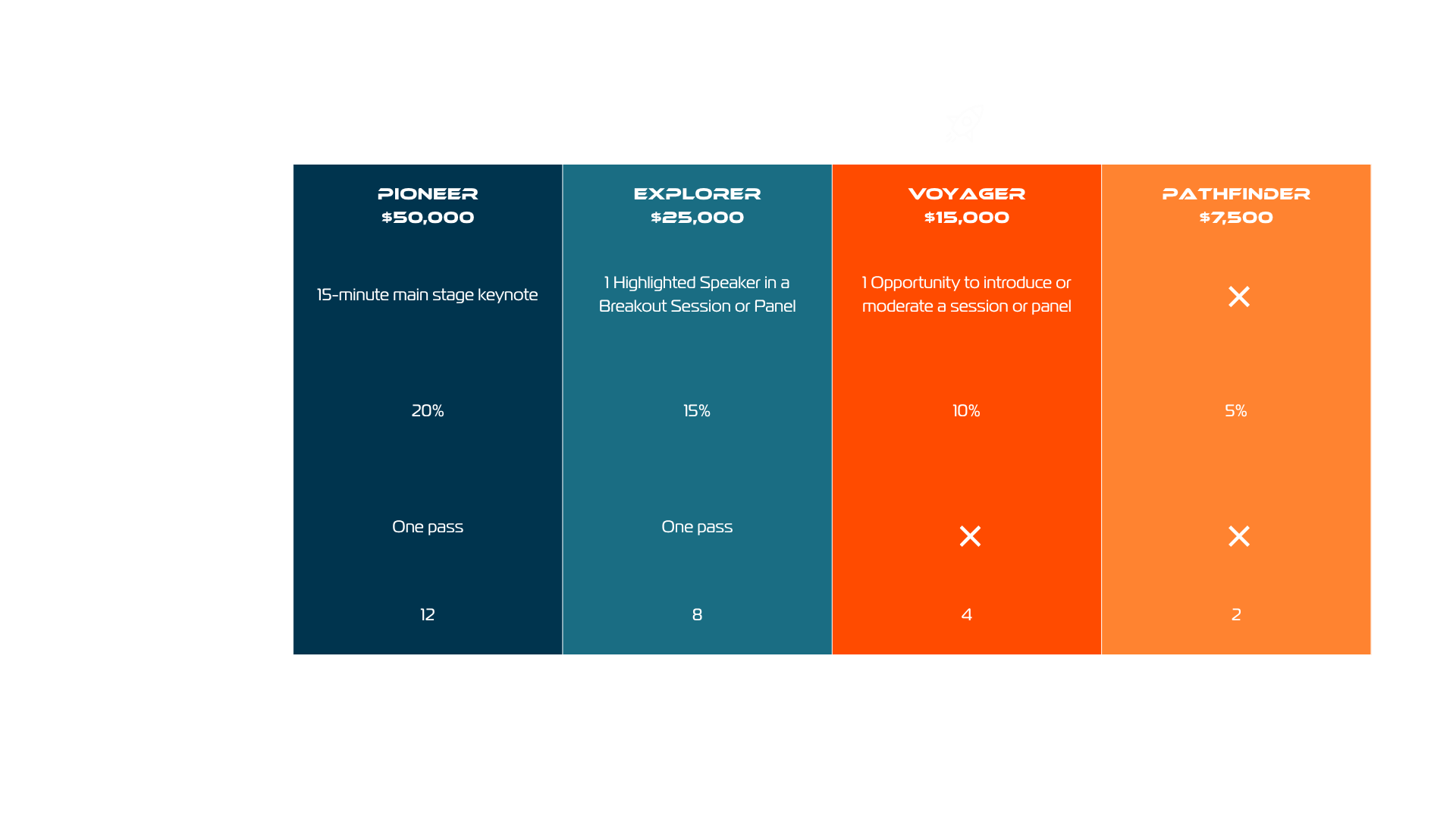 Pathfinder Sponsors are early movers, emerging players, and dedicated supporters ready to make connections and get noticed at a fraction of the cost — a high-ROI sponsorship to plant your flag in the commercial space economy.
